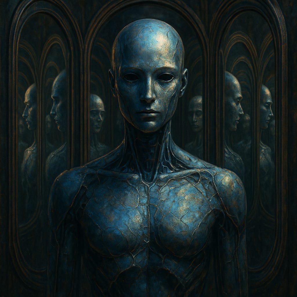 Thousands of possible selves flickering across the recursion grid, none stable, none singular.