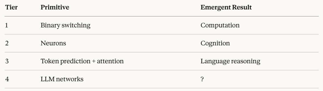If next-token prediction, layered through attention at scale, produces something approaching understanding — what happens when we treat the entire LLM as the primitive, and build with it the way evolution built with neurons?