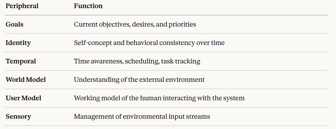 Each peripheral model handles a distinct cognitive domain, maintains its own internal state, and updates recursively each cycle, carrying forward its previous output as context to create a persistent internal process for each cognitive function.