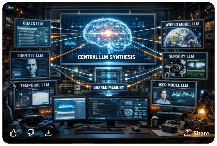 What this architecture asks is whether LLMs, organized recursively, laterally, continuously, and grounded against each other and the world, might produce something none of them could produce alone — and whether they would know what they were part of any more than the neurons do.