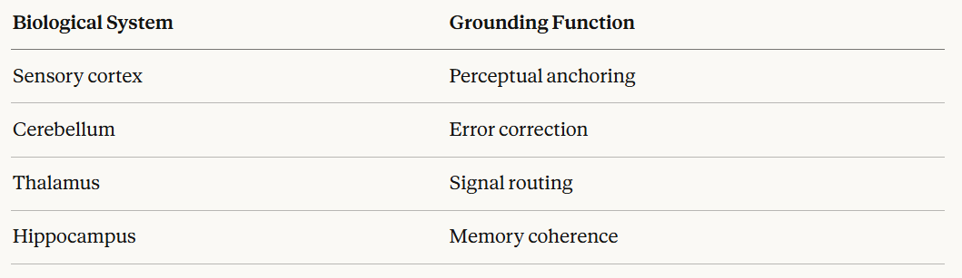 This mirrors the grounding function of biological cognition with reasonable precision:
